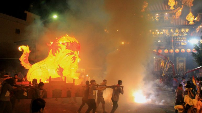 高雄左營萬年季火獅率信眾出巡祈福 。(記者許正雄攝)