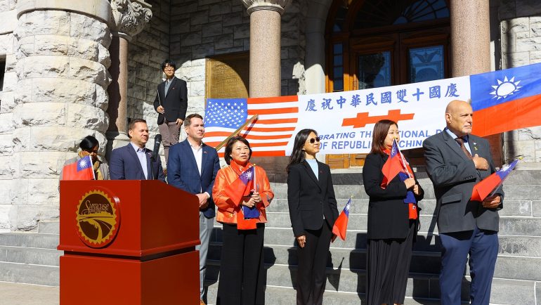 嘉義市長黃敏惠(左3)率團赴美同慶雙十國慶。(記者湯朝村翻攝) 記者湯朝村∕嘉義報導 嘉義市長黃敏惠美東時間十日上午在姊妹市雪城市政廳廣場前參加國慶升旗典禮,與雪城市長Ben Walsh等各界貴賓與上百民僑胞、留學生,祝福中華民國生日快樂。升旗前,黃敏惠並出席嘉大附小與雪城Manlius Pebble Hill School簽訂姐妹校儀式。 黃敏惠分享嘉市與雪城締結姐妹市的過程,兩市交換城市治理經驗。她說,交流過程中,深感兩市間的相似,Walsh對於雪城治理的藍圖與對於僑胞的友善,也讓市府團隊跟雪城再次牽起情誼。在七月丹娜絲颱風重創嘉義市時,Walsh也來信關心,令人感動。 Walsh表示,很高興與黃敏惠在兩市締結姐妹市三十週年之際再次見面歡度雙十國慶,並見證兩市國小簽署姐妹校,期盼這份友誼能世代傳承。 駐紐約台北經濟文化辦事處副處長張麗賢表示,雪城國慶升旗典禮市是全美唯一由市府與台灣同鄉會共同舉辦的國慶典禮,黃敏惠帶領團隊共同參與,兩市學校也簽署姐妹校,為台灣成功拓展外交更添助力。 今年的升旗典禮仍由嘉大附小的幼童軍與女童軍擔任護旗與升旗的工作。去年嘉大附小以「小小背包客」方式隨市府團隊出訪雪城,獲得學校與家長的支持;今年也於五月即展開徵選和培訓,隨市府團隊訪問美國女童軍總會及雪城市。