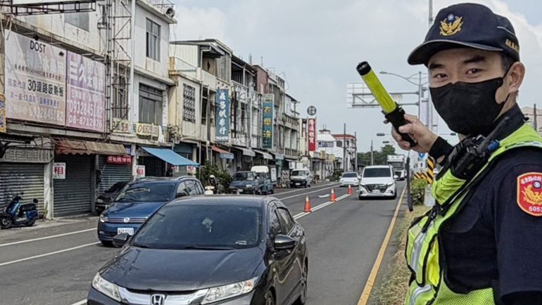 鄉親歡喜在月稱光明寺背板前拍照打卡。(福智團體提供)