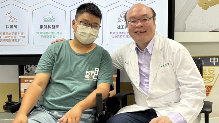 中山附醫血液病中心主任翁德甫醫療團隊引進國際創新療法,為傅男(左)爭取「恩慈療法」,是全台首名接受新型再平衡藥物,以皮下注射方式施打患者。 (記者陳金龍攝) 記者陳金龍∕台中報導 30歲傅姓男子為罕見重度B型血友病合併過敏性抗體患者,因缺乏凝血因子經常自發性出血,歷經消化道大出血、2次腦出血及拔牙後出血,多次命危旦夕,傅男留下嚴重關節病變,只能仰賴輪椅代步,所幸經中山醫學大學附設醫院醫療團隊為他爭取「恩慈療法專案」,引進國際最新非因子類藥物治療,才成功擺脫致命性出血陰影,1年多來不再嚴重出血。 傅姓男子自小確診重度B型血友病,因對第9因子藥物產生嚴重過敏反應與抗體,無法使用標準療法,只能依賴短效且昂貴的第7因子繞徑藥物止血,多年來只依靠短效、昂貴的繞徑藥物止血,雖有健保支持,但成長過程中,連拔牙都出血不止,甚至出現休克、癲癇等併發症,憑堅強意志度過難關,直到新型再平衡藥物問世,才為病情帶來轉機。 中山附醫血液病中心主任翁德甫說,傅姓病友是全台首名接受新型再平衡藥物,以皮下注射方式施打患者,療法使用與糖尿病胰島素相似筆針,患者可自行操作,自去年9月起,傅男開始每天自我施打後,1年多來不再出血,甚至進行拔牙手術時,也僅需少量繞徑藥物即可止血。 醫療團隊指出,血友病為出血性疾病,依缺乏凝血因子,分為缺少第8因子的A型與缺少第9因子的B型,其中,傅男罹患B型相當少見,且合併抗體與過敏體質,治療極為困難。 新型再平衡藥物自費療程費用超過600萬元,所幸經衛福部恩慈療法計畫補助,減輕患者經濟壓力,歷經超過1年自我注射,已鮮少出血,成功告別長期反覆出血威脅,重獲穩定安心生活。 傅男表示,數月來能操作電動輪椅,在台中街道自由穿梭,從家裡到醫院回診也不需他人協助,甚至獨自搭高鐵參與外地活動,新藥出現,不僅改善病情,也重新掌握生活自主權,象徵血友病治療一大突破。