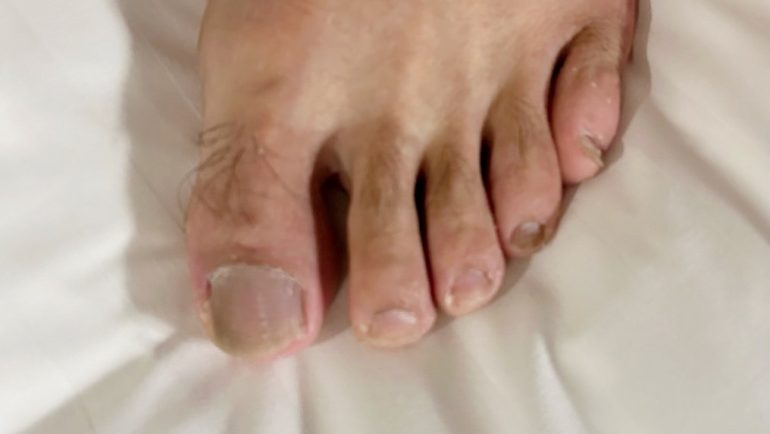 吳佳玲表示,個案李先生因帶團關係需長時間穿襪穿鞋行走,如遇雨浸濕鞋襪也無法及時更換,加上又經常到公共澡堂泡湯,增加黴菌感染風險與滋生機會,因此灰指甲找上門。灰指甲可能發生於手腳指甲,不會自行痊癒,透過抗黴菌口服藥物,連續3個月的治療即可根治。
