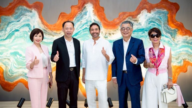 慶山建設總經理陸鴻慶(左二)力邀國際藝術家Tobias Tovera(中)帶來世界級的能量創作。(記者楊文琳攝)