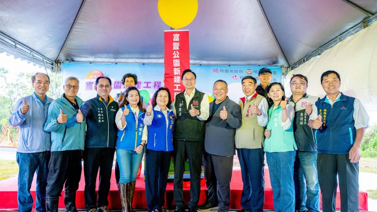 張善政指出,富豐公園所在地原為楊梅區第八公墓,占地約一公頃,於民國九十九年公告禁葬後便閒置多時。區公所於一一二年編列二百萬元預算進行規劃設計,工程總經費約二千萬元,於一一三年七月動工,一一四年七月完工,並於二十一日正式啟用。園區設有兒童遊戲區、體健設施與籃球場等多功能設施,歡迎市民朋友前來休閒遊玩,多多利用這處嶄新的生活綠地。
